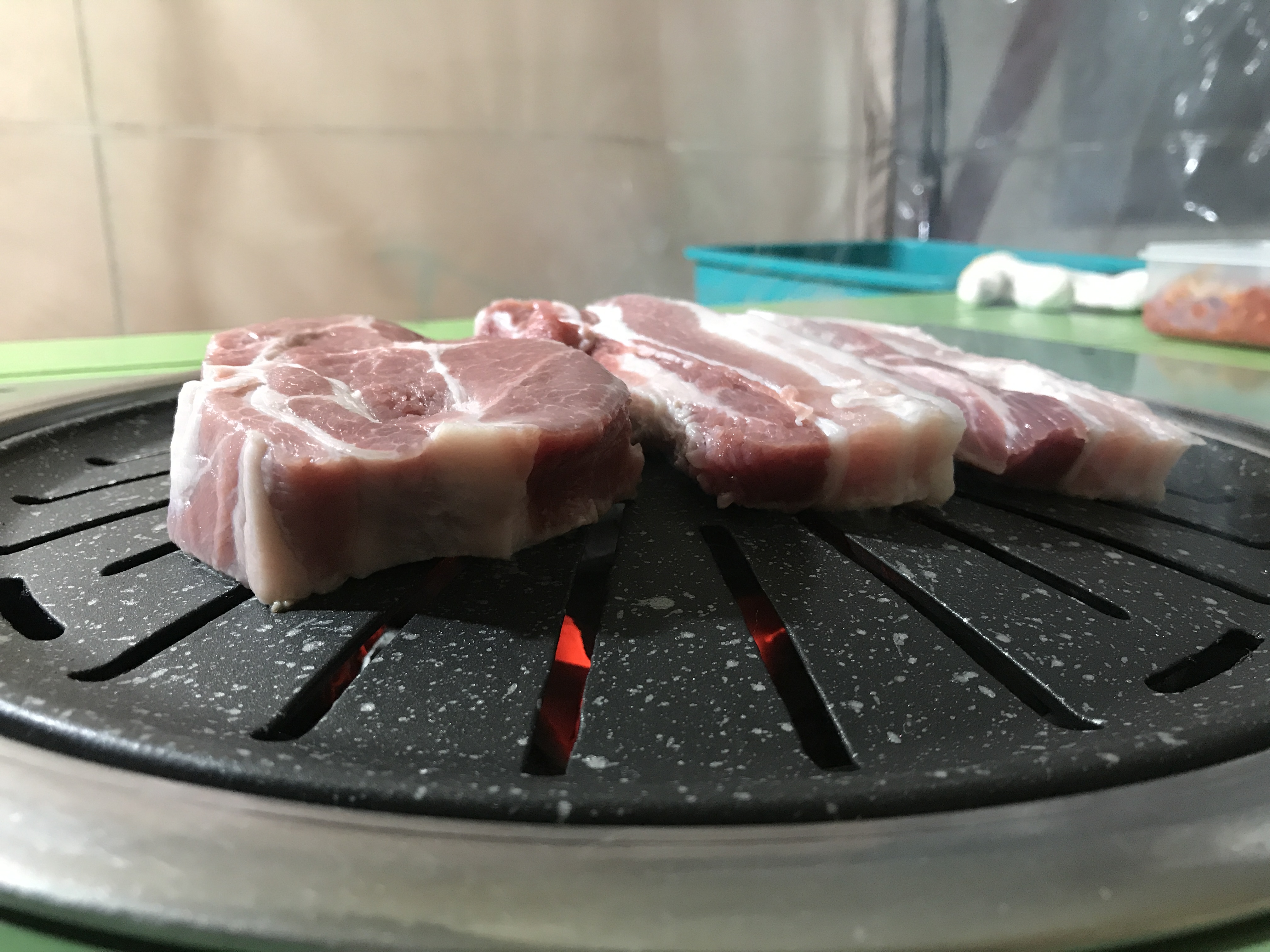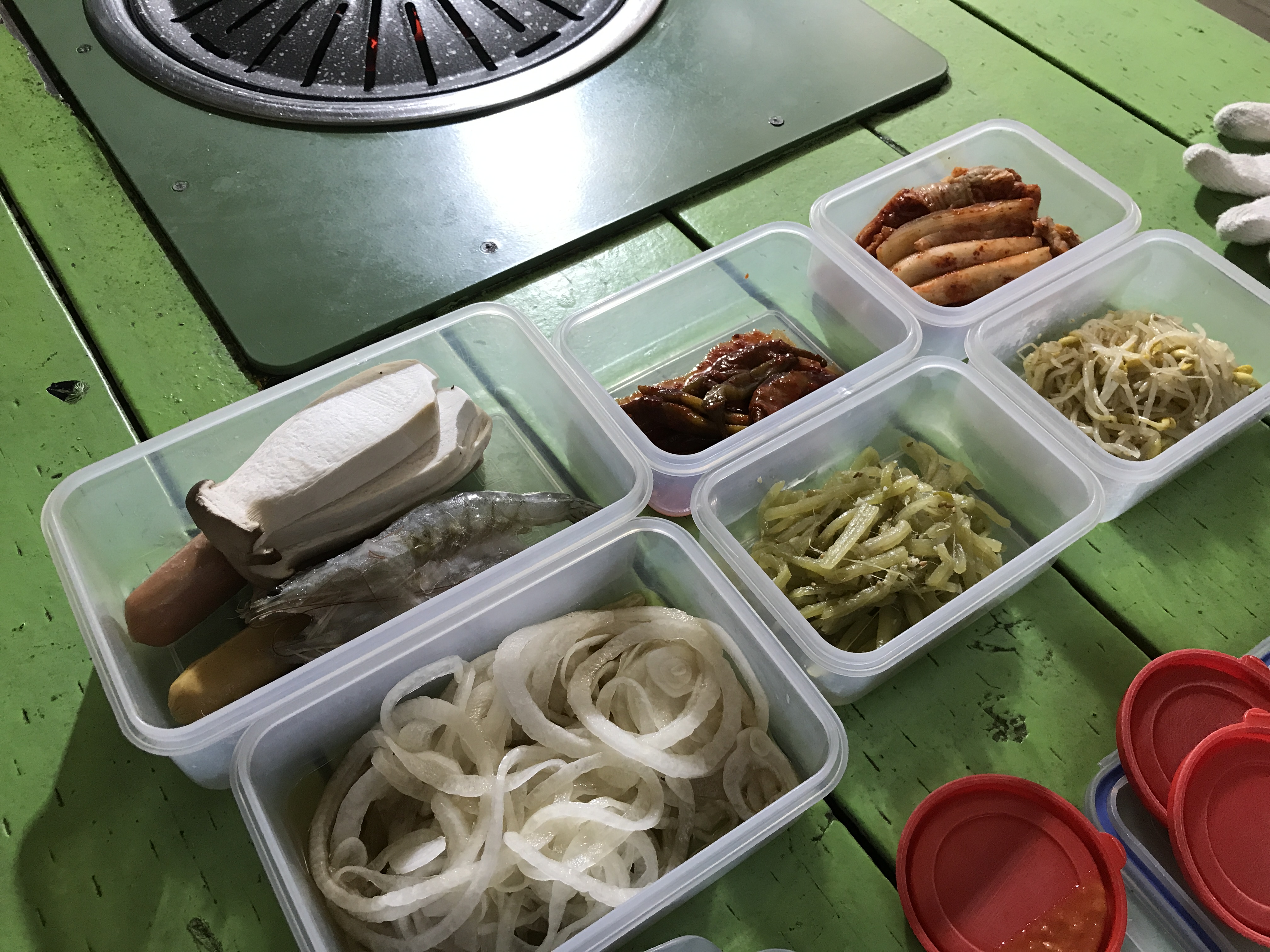 고기 숯 반찬 햇반 물