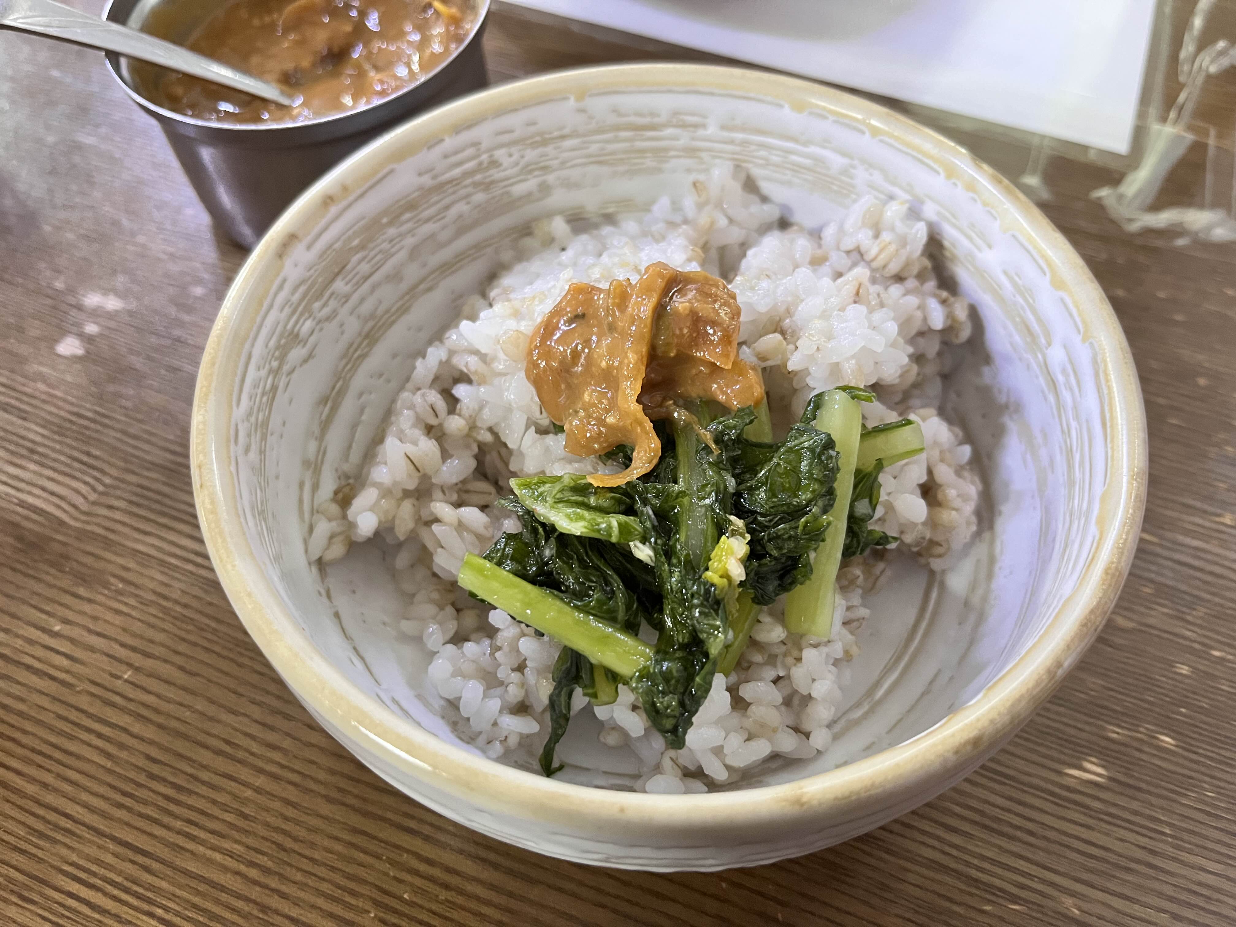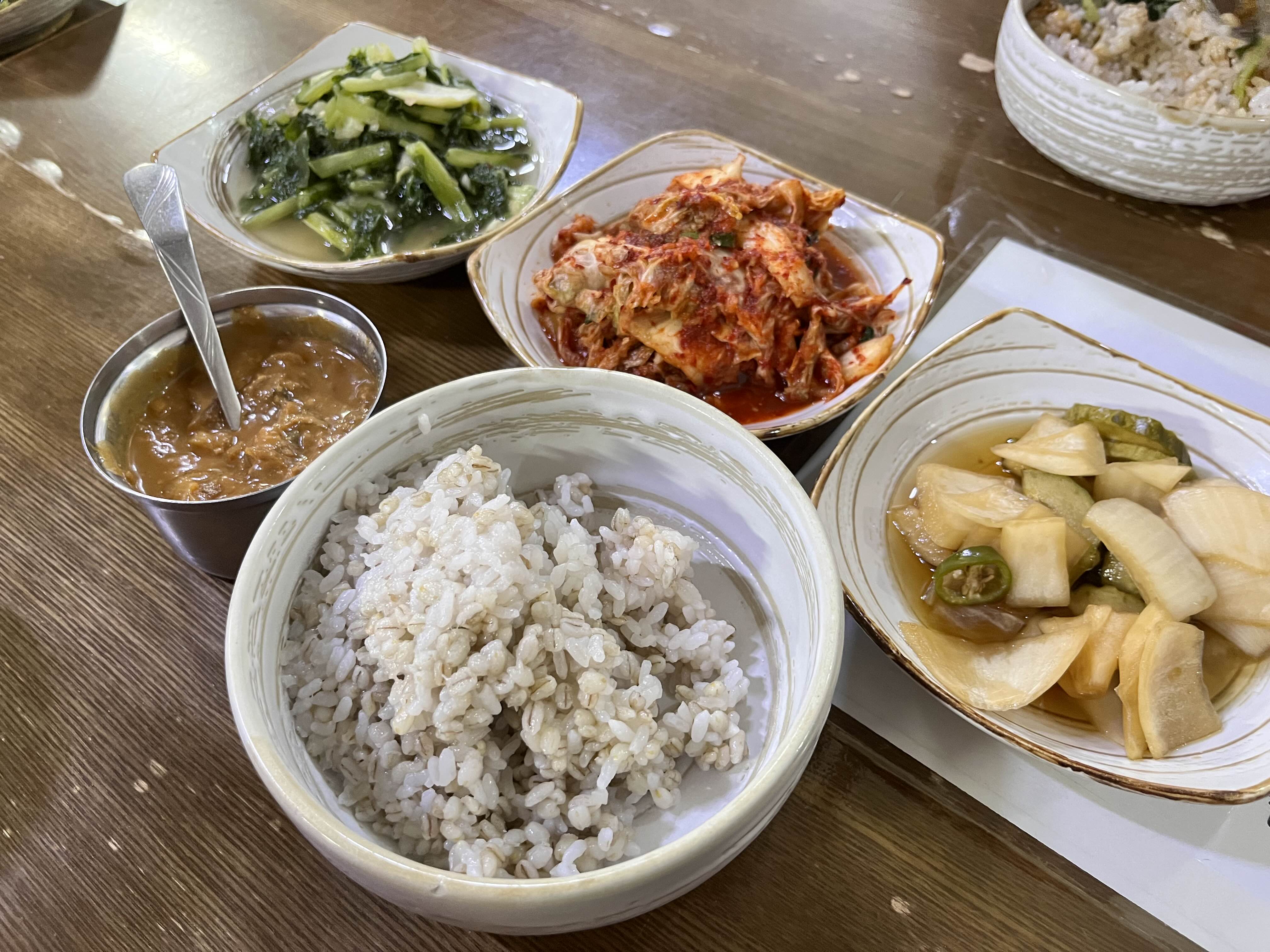 보리밥과 강된장 열무 김치 양파장아찌가 나왔다
